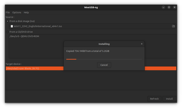 在按下“安装”按钮后,woeUSB 将开始格式化和复制文件。你需要等待一些时间,因为这里有大约 6 GB 的文件需要复制。