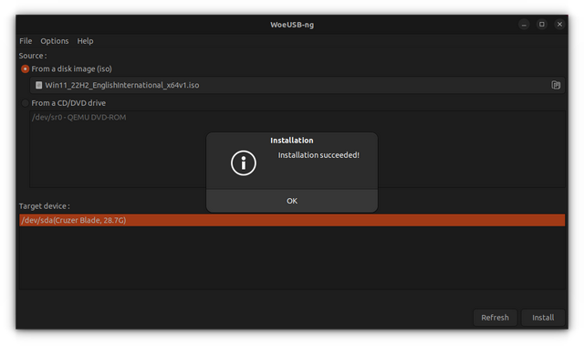 在复制完成后,WoeUSB 将会提示一个成功的对话框。你现在可以安全地弹出 USB 驱动器,并将其作为一个可启动 USB 驱动器来使用。