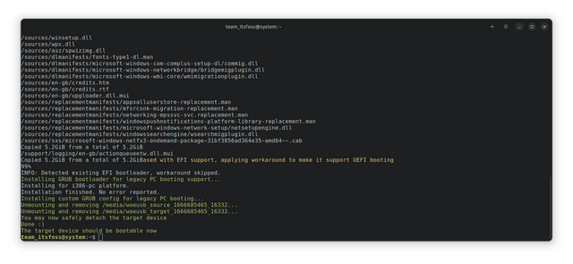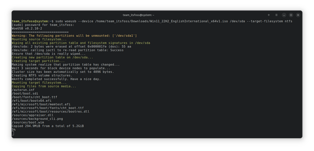 在这里,--device标识用于擦除 USB 和从零开始创建一个可启动 USB 驱动器。同样,--target-filesystem标识用于设置为 NTFS ,来避免将要复制的文件大小超过 FAT 文件系统的限制。