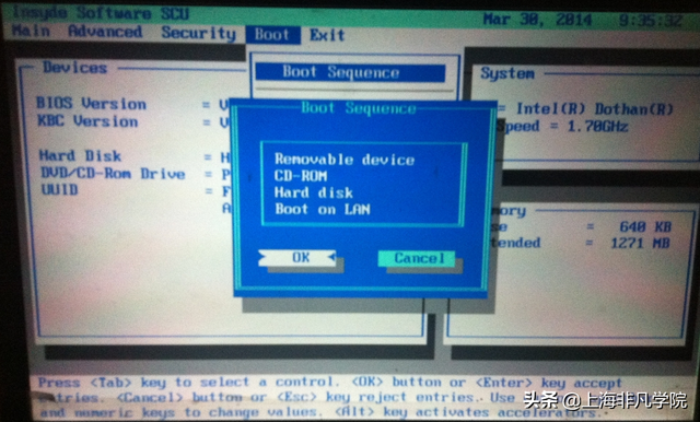 在这一界面,是设置哪一个是优先启动的。Removable device 就是我们要用到的U盘设置,在这里重点使用方向键两侧的两个键,PgDn 和PgUp 以此来调整哪一个是优先启动的!千万不要以为把光标移到到这一个选项上,接着按Enter键,就是选择上了!这是网络管理员培训老师多次尝试后依然不成功的关键!通过PgDn 和PgUp来选择这四个的排序,排序完成后,用方向键把光标移到到OK上,这是右侧会有一个小的实心三角形,接着按Enter键,完成设置。