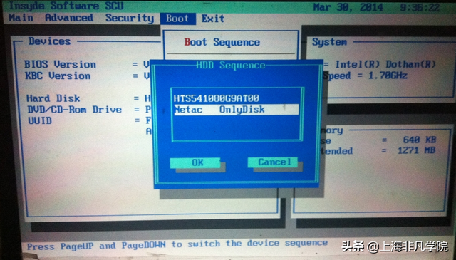 电脑注意图上的第一个HTS541080这个长长的是电脑的硬盘名称,下面的Netac OnlyDisk 是U盘的名称,根据每台电脑和U盘的不同,这里会有所不同,但设置的方法是一样的。注意还是要用PgDn或PgUp来调整启动时哪一个是优先的,不能用方向键选择!!!