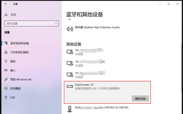 3、我们在左侧栏目中选择蓝牙和其他设备,然后在右侧的列表中我们可以看到U盘,点击删除设备。