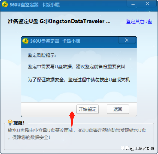第5步:点击开始鉴定按钮,弹出一个提示。为了数据安全起见,最好做好数据的备份。