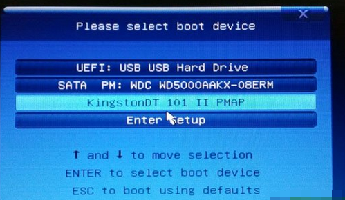 B、进入启动项的选择画面后,只需要通过上下方向将将光标移至如下图所示显示为“USB:kingston DataTraveler”的选项即选择U盘所在的选项,如图所示。
