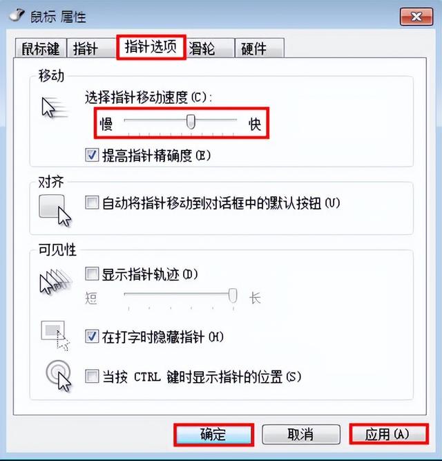 3点击选择“指针选项”菜单,调整拉动条进行指针移动速度的调整,点击“应用”-“确定”。如下图所示: