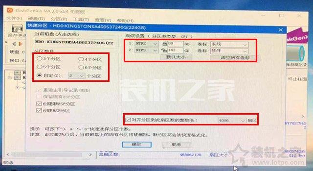 10、经过刚刚的“转换分区表类型为GUID格式”设置之后,现在分区的分区表类型已经是GPT格式了。我们设置想要分区的数目,例如我想要分两个区,点击自定选择2个分区,系统C盘分了80G,剩下空间留给了D盘。默认勾选“创建新ESP分区”以及“创建MSR分区”。对于固态硬盘,最好要4K对齐分区,选择4096扇区吧,最后点击确定,关闭diskgenius分区工具。