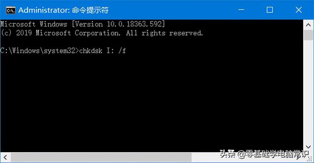 2. 在其中输入“chkdsk[空格][盘符]:[空格]/f”,例如我的U盘盘符为“I”,那么我输入“chkdsk I: /f”,回车运行