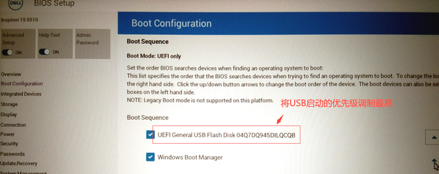 左边选 Boot Configuration, 然后通过调整启动项右边的上下剪头调整顺序,把U盘放到最上面.