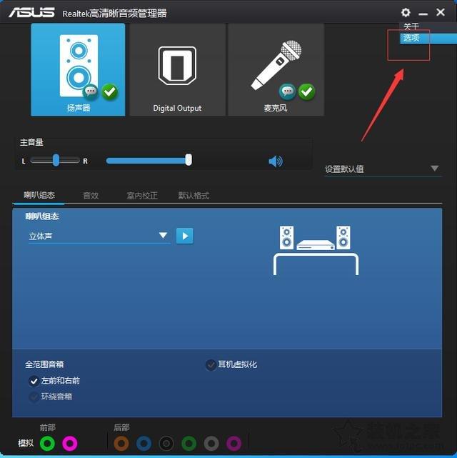 3、这时进入Realtek高清音频管理器界面中,我们这是华硕主板,其它品牌设置方法大同小异,我们点击“齿轮”的设置图标,如下图所示: