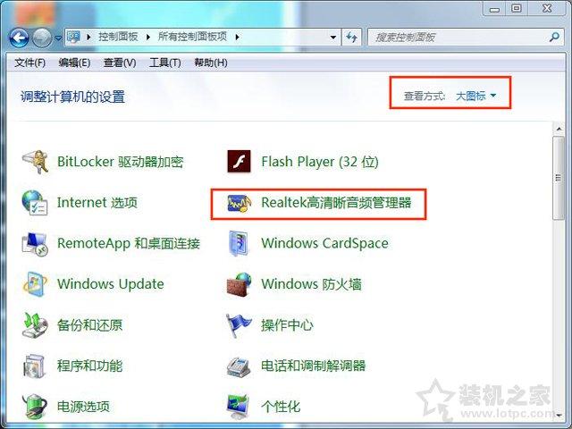 2、在控制面板中,我们将查看方式修改为“大图标”,选择“Realtek高清晰音频管理器”,如下图所示。
